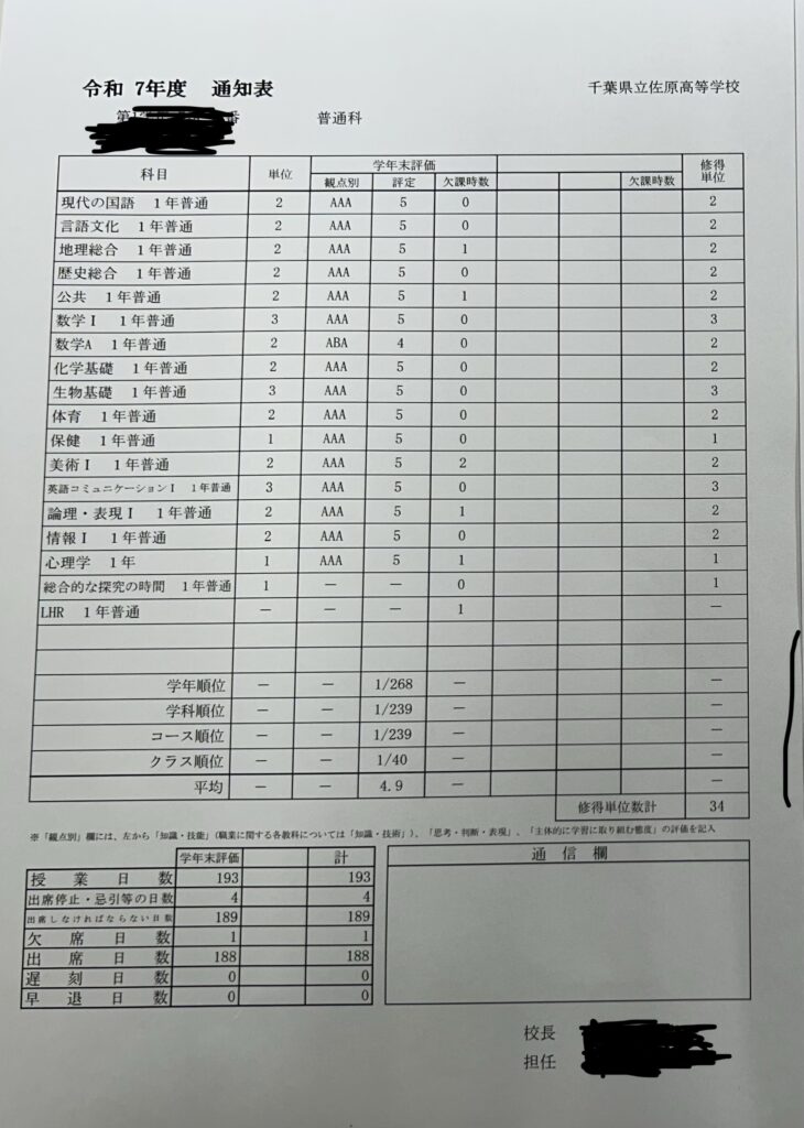 一年が終わり春休みという学年の区切りに入りました。結果というのは最後に必ず出てくるものでその結果が生徒さんから示されて本当に頑張ってくれました。数学以外全部5を取ってきてくれました。評定平均4.9は本当に頑張りました。まだ高校1年生ですからこれか頑張ってもらえれば、必ず第一志望に進学出来るでしょう。