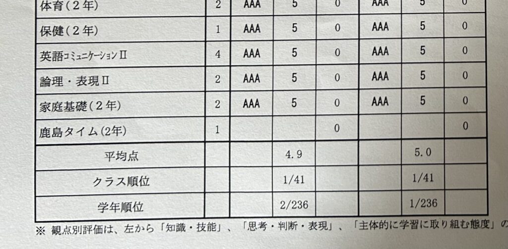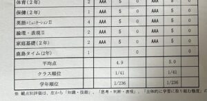 次々と生徒たちが通知表を持ってきてくれますね。結果がいいこといいこと。みんな頑張ってくれるので通知表持ってくるのが楽しみです。結果は見ての通り2年の評定平均が5です。左が前期終了時のもので右が通年での評価になりますね。全教科5のパーフェクト達成しました。もう、文句なし。頑張りました。この生徒さんは高校2年生なのであとは高校3年の前期をうまく乗り越えれば、かなり高い評定平均が作れますので推薦で決まりだと思います。学校で高校1年生からしっかり学習している生徒さんはみんな推薦で大学を決めます。成績のいい生徒さんほど計画的に受験をするものです。